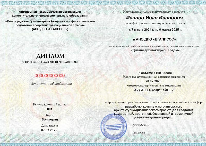 Обучение по такой программе – способ освоить новую профессию на основе ранее полученного образования. В дипломе выпускника указывается его ФИО, наименование учебной организации, название и длительность программы. Документ заверяется подписью руководителя и печатью АНО ДПО «ВГАППССС».
