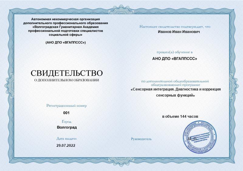 Сенсорная интеграция. Диагностика и коррекция сенсорных функций (144ч)