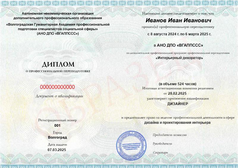 Обучение по такой программе – способ освоить новую профессию на основе ранее полученного образования. В дипломе выпускника указывается его ФИО, наименование учебной организации, название и длительность программы. Документ заверяется подписью руководителя и печатью АНО ДПО «ВГАППССС».