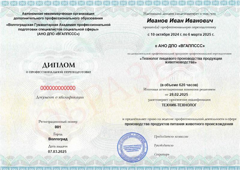 Обучение по такой программе – способ освоить новую профессию на основе ранее полученного образования. В дипломе выпускника указывается его ФИО, наименование учебной организации, название и длительность программы. Документ заверяется подписью руководителя и печатью АНО ДПО «ВГАППССС».