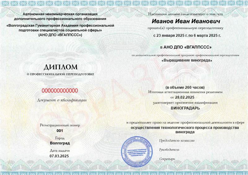 Обучение по такой программе – способ освоить новую профессию на основе ранее полученного образования. В дипломе выпускника указывается его ФИО, наименование учебной организации, название и длительность программы. Документ заверяется подписью руководителя и печатью АНО ДПО «ВГАППССС».